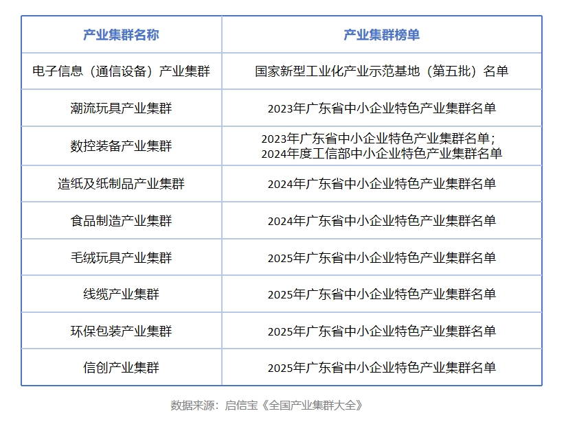 东莞是一个由高度专业化镇街构成、分工明确的产业生态网络。启信宝数据显示,东莞形成多领域、多层次的重点产业集群布局,其中电子信息产业集群入选国家新型工业化产业示范基地(第五批)名单;自2023年起,潮流玩具、数控装备、造纸及纸制品、食品制造、毛绒玩具、线缆、环保包装、信创等8个产业陆续入选广东省中小企业特色产业集群名单,仅2025年便有4个产业入选。这些集群的认定时间跨度连续,且高度细分,显示出东莞产业的强劲活力。