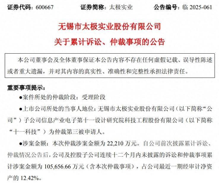 9月17日,太极实业(600667)公告,公司子公司十一科技于近日收到上海国际经济贸易仲裁委员会(上海国际仲裁中心)仲裁通知。